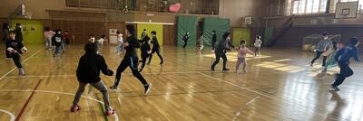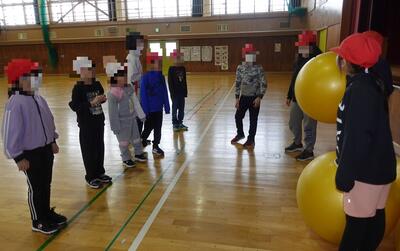 12月13日。ロングタイムに、4年生が1~3年生を招待して、新スポーツで遊びました。4年生が考え出した遊びです。コートの大きさを決め、大きなバランスボールを使っておにごっこをします。おにはバランスボールを転がしながら追いかけ、ボールを当てられたらおにが交代です。おには協力して追い込んだり、当てられそうになっているスキを狙って当てたりと、攻防を楽しんでいました。短時間ではありましたが、とても運動になる新スポーツを考えてくれました。