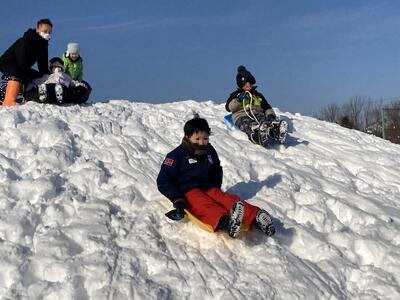 22日。晴天の中、子どもたちは築山を使って、チューブ・そり遊びをしていました。冬のこの時期は何かと屋内での活動が増えてしまうのですが、元気に、そして楽しげに遊んでいる子どもたちの様子は、とても頼もしく思えました。チューブが劣化のため2本しかなくなってしまったものの、順番を守ったり、貸し借りしている様子は、ここでも学びがあるのだと感じました。