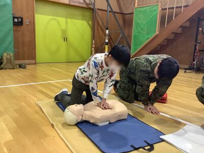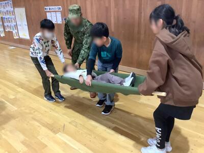 3・4時間目の1日防災学校では、自衛隊の方を講師に招き、有事の際に自分の命を守る方法や救急救命・応急処置等について教えていただきました。東日本大震災から14年、自助・公助という言葉が聞かれるようになって久しいですが、何時、何処で災害が訪れるか分かりません。自らの命を守る大切さについて学ぶことができた1日でした。